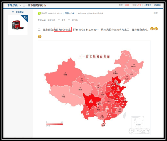 我们在《卡车之家·卡友杂谈》的论坛上,找到了其内部人员发出的“XX重卡服务商分布”图,从全国分布来看,的确如报道所说的“全国覆盖”。但笔者在其企业官方网站上进行服务网点的查询,不仅各省级行政区服务商数量与该地图上标数量不一致,服务商总数量也不一样。