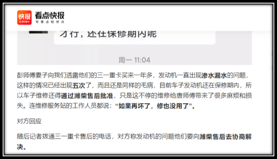 据《看点快报》“蓝海豚卡车之声”报道,2020年1月,来自安徽阜阳的彭师傅投诉,他在购买该重卡产品一年多来,发动机已出现“5次渗水漏水”问题,该重卡品牌售后电话给出的解决方案是“找潍柴(该重卡发动机供应商)售后去协商解决”。这种“推脱给供应商合作伙伴”的处理方式,不仅不顾“不停维修”给用户带来的麻烦和损失,也不禁让人对其合作态度表示心寒,难道出现问题只靠一味推脱?