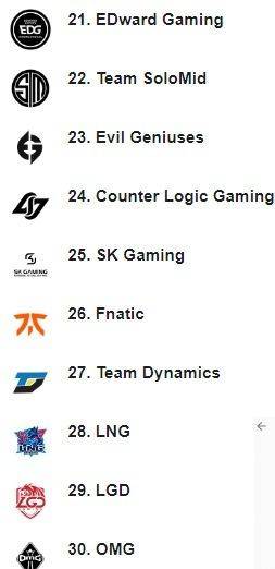 在这前十名中LPL占据五名,后面LPL队伍的排名是WE第14,SN第19,RNG第20,EDG第21,LNG第28,LGD第29,OMG第30,VG第31,BLG第34,DMO第35,ES第36,RW第44。