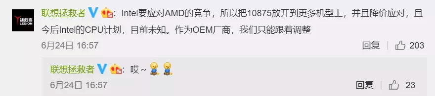 6月24日,面对汹涌的舆情,联想拯救者官方微博表示“高配低价”问题是英特尔为应对AMD的竞争,对相关处理器产品降价处理所致。