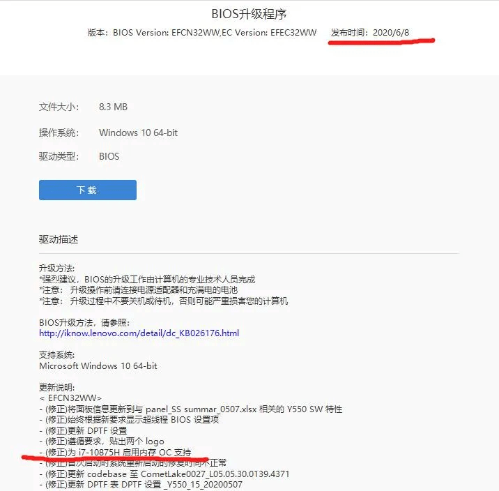 ▲6月8日发布的BIOS升级内容中包括i7-10875H处理器相关问题
