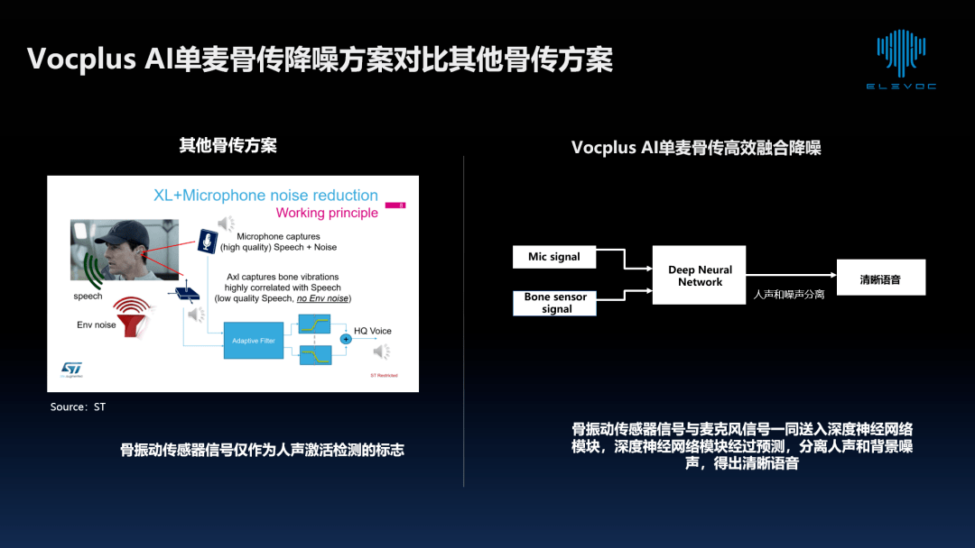 大象声科骨传导通话方案同时使用骨传导传感器和单颗麦克风,利用 AI 技术将二者采集的信号进行有机的融合。利用骨传导信号提供的重要声学特征(如 VAD 和基音信息)对麦克风信号进行降噪和融合,达到比直接对麦克风信号进行降噪更好的效果。