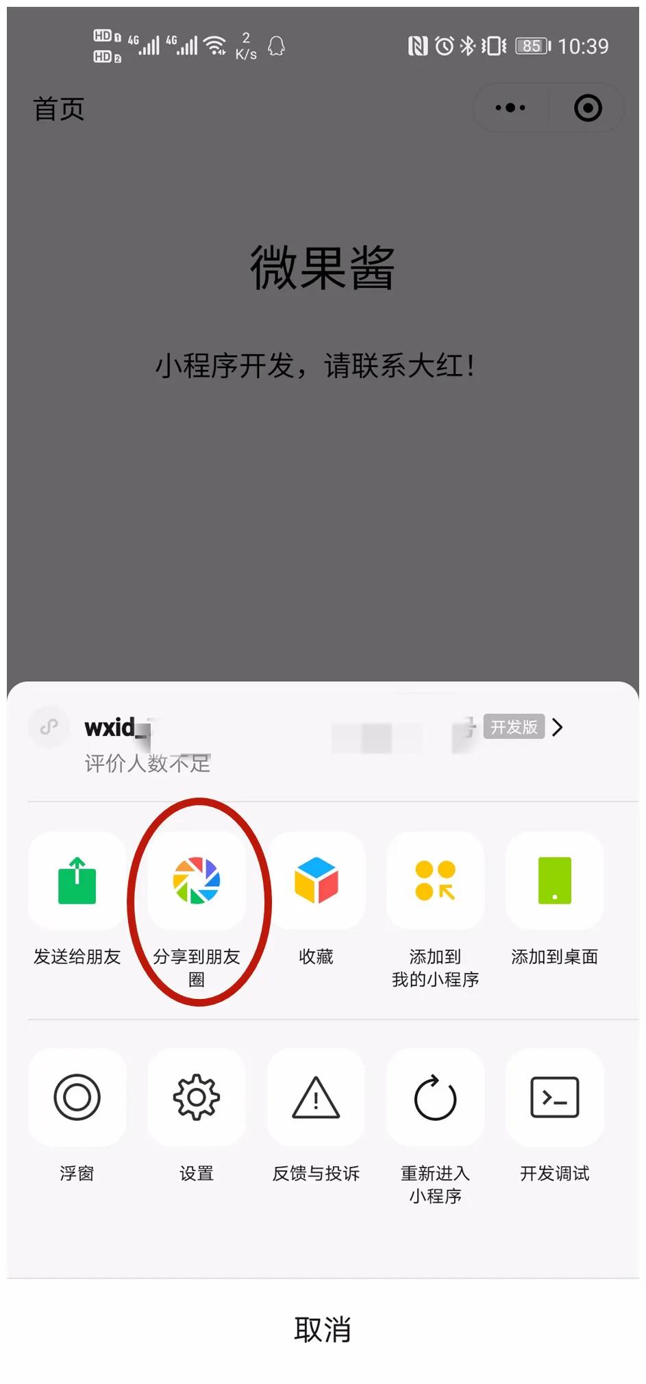 微信在安卓系统灰度测试小程序分享朋友圈功能。