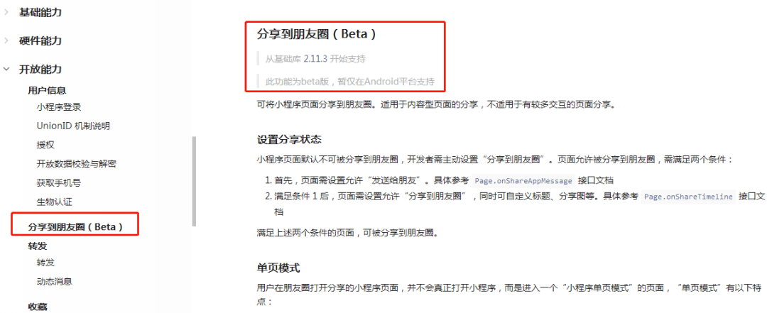在开发文档里,官方特意强调朋友圈打开的只是小程序的单页模式,我们也根据文档把单页模式的一些重点总结如下: