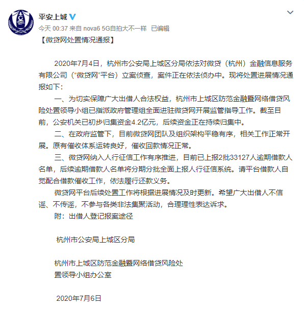 新京报贝壳财经讯 7月7日,杭州市公安局上城分局@平安上城 发布公告通报微贷网处置情况,称其已初步归集资金4.2亿元,目前微贷网团队及组织架构平稳有序。