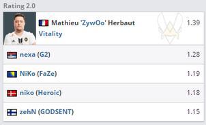 在决赛的四张地图中,Vitality仅仅赢下了一场,但ZywOo仍旧打出了1.20的高rating。和BLAST Premier春季总决赛相比,ZywOo的赛事rating又有所提升,来到了1.39。