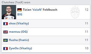 在残局对抗方面,BIG的tiziaN力压shox,mantuu和flusha,成为第一。除此之外,他的1v1残局胜率高达87.5%。