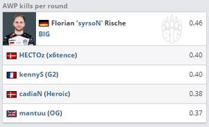在BLAST Premier春季赛上,syrsoN凭借着精湛的狙击水平让许多观众意识到了又一位强力狙击手的出现。而在cs_summit6上,syrsoN强势依旧,打出了0.46的AWP KPR和293个AWP击杀。