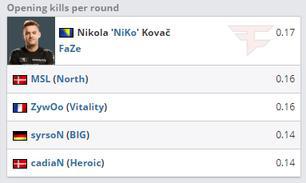 和BLAST Premier春季赛相比,NiKo的首杀数据有着很大的提升。KPR保持在0.17,为赛事第一,而首杀rating也达到了可怕的1.35,仅次于ZywOo的1.36。