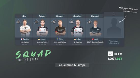 导语:HLTV根据Fantasy系统,统计出了cs_summit6各个位置上表现最好的选手(笔者注:此名单来源于HLTV对各项数据的加权统计,仅供参考,并不完全代表选手实力,队内位置分配及赛场表现)。