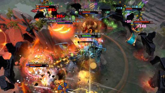顺便一提,RNG除了二号位上的是二队的人外,今天的四号位也是二队的FelixCiaoBa。比赛中,FelixCiaoBa的滚滚在几波团战中都限制了死灵龙的发挥。言归正传,先说一下30分钟的肉山团战,这是EHOME离翻盘最近的一次。当时,操刀玛尔斯的Flywin在没有BKB的情况下直接跳大——跳进入就白给,而且买不活!正面五打四,嗅到了机会的EHOME发动了致命的反击。先是大招结束的滚滚被Pom神箭命中,然后是神谕和TB被拍拍熊抓死——拍拍熊一换二,塞拉死了也赚!最后,买活到场的滚滚刚刚进来就被死灵龙晕住。滚滚连死两次,这是一波来自RNG的五人团灭。拍拍熊复活带盾,EHOME距离翻盘只有一步之遥。