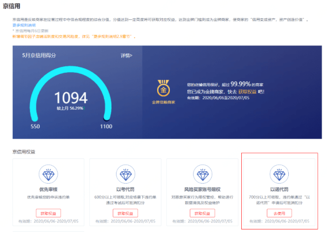 6月30日,京东面向商家上线“以诺代罚”功能。针对部分非刻意违规行为,京信用分数达到700分以上的商家可以签署承诺函,承诺一段时间内不出现重复违规,平台可豁免部分处理措施,但之后若重复违规就会加重管控。