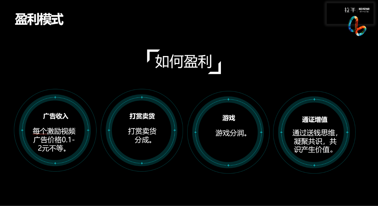 那么拉手短视频未来的营收和红利究竟有多大,短视频营收分为下面几个版块,最大的就是广告收益,所有互联网企业80%的收入都是来自于广告营收,上面也说到了抖音短视频2020年第一季度广告营收超过了百度、微信、QQ、新浪的总和。说明什么,短视频的广告营收更加庞大。第2个为打赏卖货,通过打赏卖货,获得卖货的分成;第3就是游戏板块,第4个通过区块链送钱的思维,获取用户的大数据,凝聚共识,共识产生价值使平台增值、平台通证增值。 通证经济改造的平台和传统的平台最大的区别就是,传统平台所有的营收和价值被平台方独享,通证经济的平台就是把所有的营收和价值与为平台每一位贡献者共享。任何平台如果拥有庞大的流量和粉丝,那么它的营收和价值一定是巨大的,如果平台把所有营收回馈到平台,那么这个平台的权益证明的价值一定是巨大的。