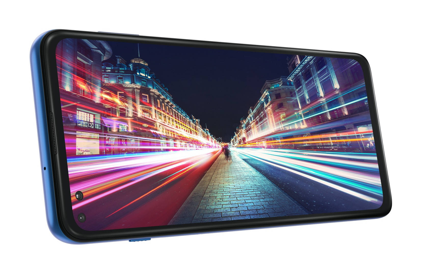 Moto G 5G Plus 正面采用双打孔屏幕设计,有别于双摄打孔屏常见的“药丸”造型,两个开孔分别独立,在如今算是相对有辨识度的一种前面板造型;机身为塑料材质,侧置的指纹识别模块与电源键合一,整机重 207g。