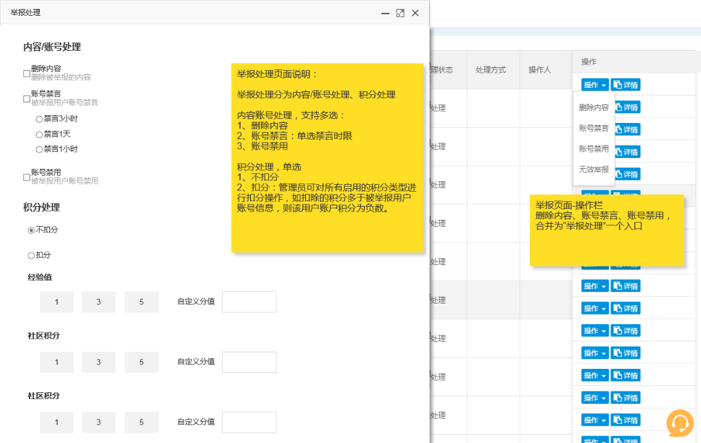 举报列表中操作栏中删除内容、账号禁言、账号禁用、无效举报合并为一个“举报处理”按钮