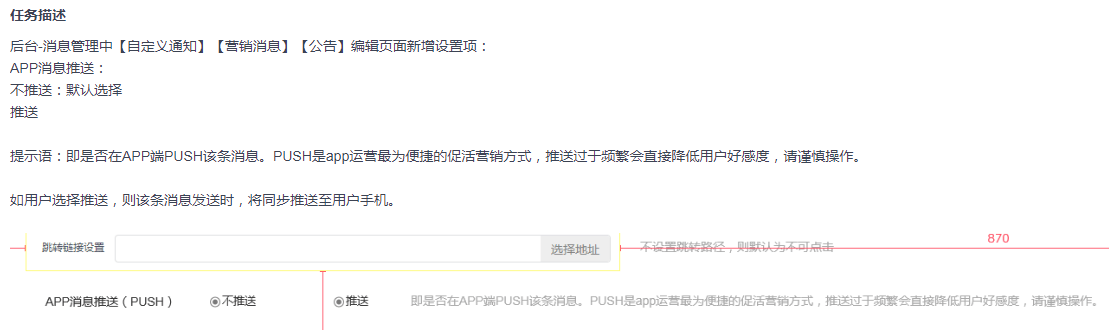 1、2.5新版本新增功能: 后台-消息管理中【自定义通知】【营销消息】【公告】编辑页面新增设置项:“APP消息推送”;
