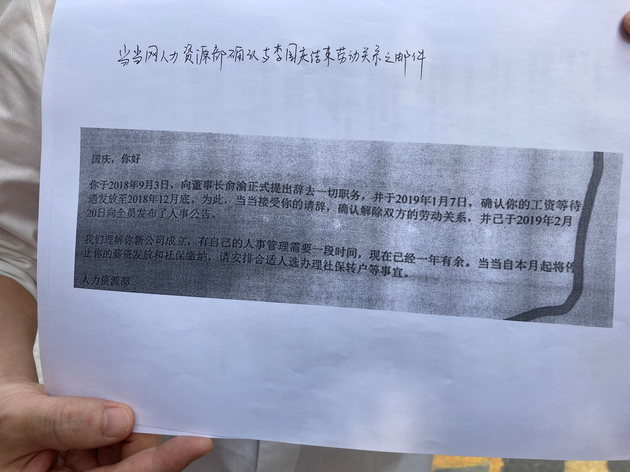 当当方面所示文件显示,2018年9月李国庆向董事长俞渝提出辞职,1月7日确认李国庆的请辞。2019年2月,当当发布李国庆辞职的人事公告,继而在10月李国庆的新公司筹备期之后,为李国庆停缴社保。