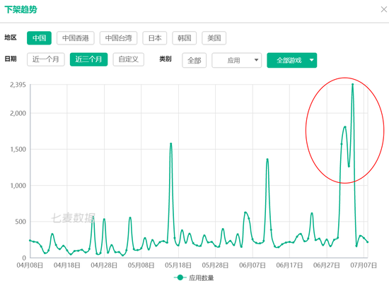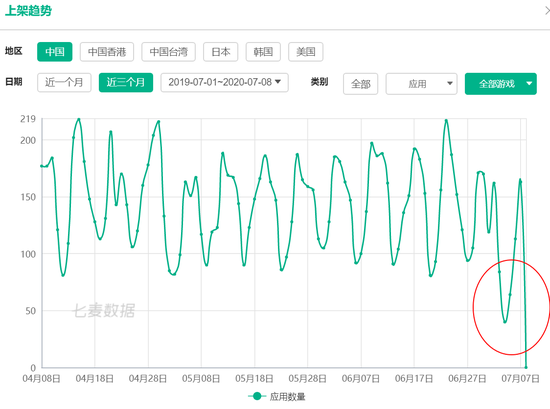 新京报贝壳财经讯(记者 陆一夫)在版号新政落地一周后,苹果App Store的游戏应用上架量已大幅降低。根据移动产品分析平台七麦数据的统计显示,7月1日至7日期间,苹果App Store的游戏下架数量较以往出现大幅升高,一周内游戏应用下架数量达7753款;游戏上架数量则创下近期新低,上架游戏应用总量为735款,其中绝对大多为免费游戏。
