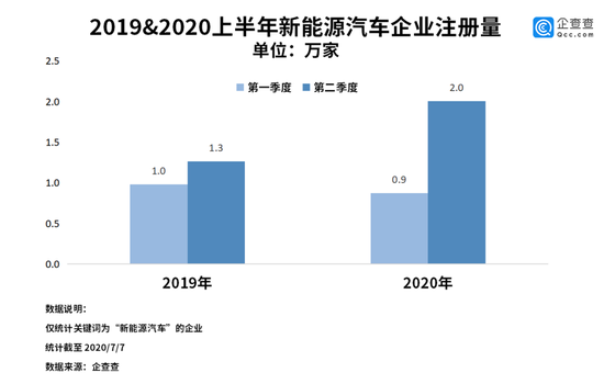 2020年1月至6月,我国新能源汽车相关企业注册量为2.9万家,相比2019年同期上涨了26.1%。其中二季度数据为2万家,相比一季度环比上涨122.2%。