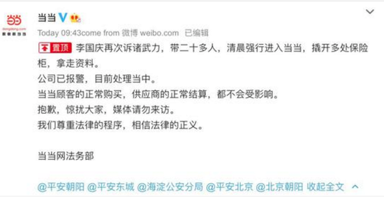 7月7日,庆俞之争又迎来第二波高潮。俞渝发布了一封全员内部信,提及李国庆在清晨6时许,带30人来到办公室,将保安堵住,进入办公区,用电钻撬开保险柜,抢走了营业执照和U盾,保安受伤,当当网方面已报警。