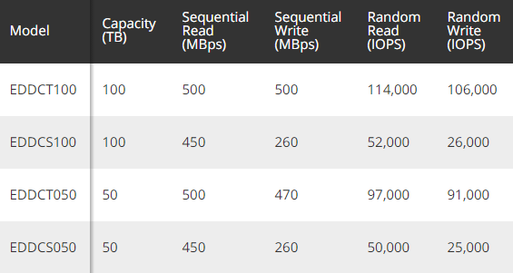 性能方面,100TB SATA版本持续读写500MB/s、500MB/s,随机读写114K IOPS、106K IOPS,SAS版本则要慢很多,分别是500MB/s、260MB/s、52K IOPS、26K IOPS。