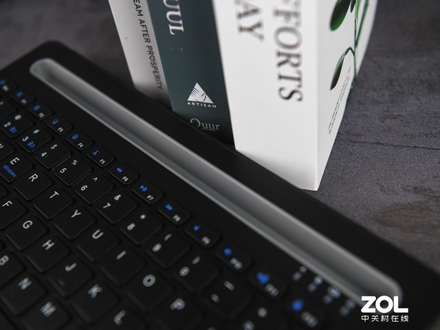 键盘上方自带一个很深的凹槽,宽度为12.5mm,可以支持9.7英寸的ipad横放,也可以插入手机或Android平板使用。凹槽作为支架使用时,会使屏幕带有110°左右的仰角,刚好适合观看。