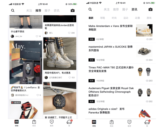 从潮流电商的层面来看,他们不断迭代APP设计,在用户交互方面提供社交功能,也是在与消费者共同搭建潮流社区,从而传播潮流理念,引领潮流风向,并为消费者提供消费指南。以得物App为例,得物App初版以资讯App上线,帮助年轻人了解球鞋文化和潮流资讯;随后,得物App专注打造国内主流Sneaker互动社区,通过持续沉淀潮流向话题内容,成为中国潮流文化沃土;2017年上线交易至今,已成为全球时尚消费领域的领先者。