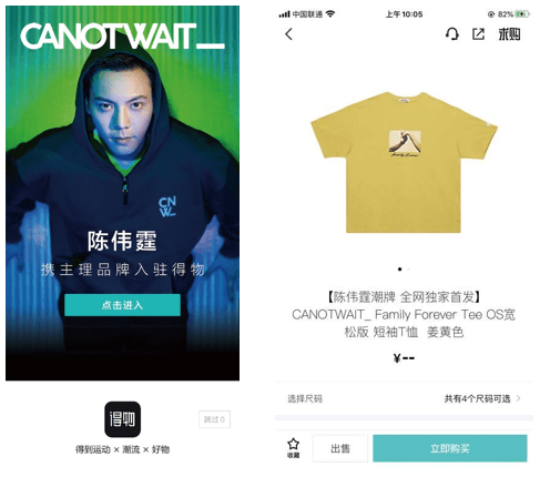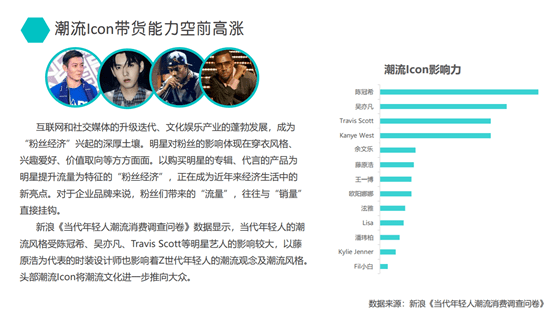 新浪调查报告显示,陈冠希、吴亦凡、Travis Scott等明星和时装设计师对Z世代年轻人的潮流风格与潮流观念影响较大,将潮流文化进一步推向大众就是这些头部潮流icon。例如陈伟霆主理的品牌CANOTWAIT_入驻得物App后,8小时微博话题阅读量超过2亿,话题讨论量超过18万。4月25日,该品牌选择在得物App进行全球独家首发,所有商品开售3小时内即全部售罄。