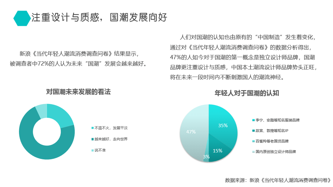 相关问卷数据显示,47%的人对于国潮的第一概念是独立设计师品牌,认为国潮品牌更加注重设计与质感。国潮产品优质的设计与理想的质量不断攫取年轻消费者的注意,越来越多的年轻人开始选择国潮、偏爱国潮,国潮市场展现出旺盛的生命力。