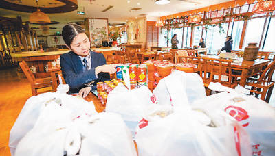 北京西城区虎坊桥的京天红酒家推出了“荡秋千”外卖方式。杜建坡摄(人民图片)