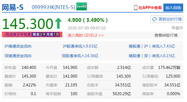 7月9日上午消息,网易港股涨幅超3%,截至发稿,网易涨3.49%报145.3港元,股价刷新历史高位,市值达5020.29亿港元。