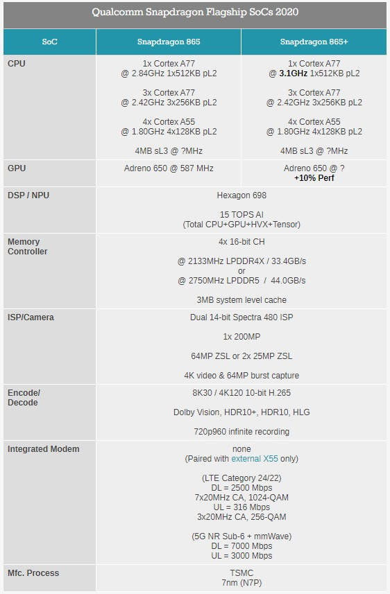 除此之外,骁龙 865 Plus 其它组件与骁龙 865 保持一致,也仍要通过外挂 X55 调制解调器获得 5G 网络的连接能力。