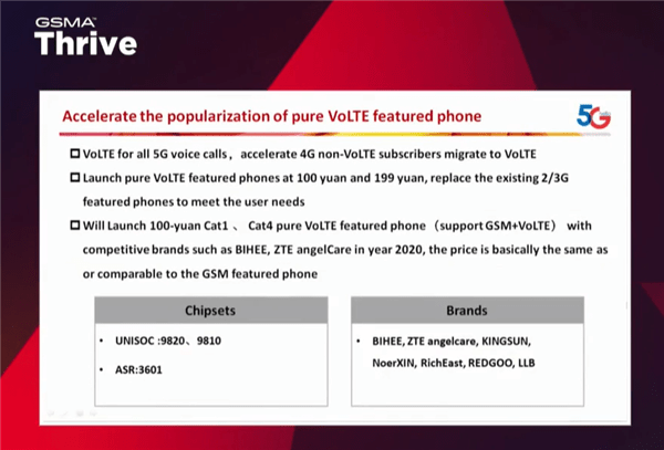 2020年,中国电信将加快推进纯VoLTE功能手机的普及,加速4G非VoLTE用户迁移到VoLTE。打造100元和199元两个价位段的纯VoLTE功能手机,替换现有的2/3G功能手机以满足用户需求。