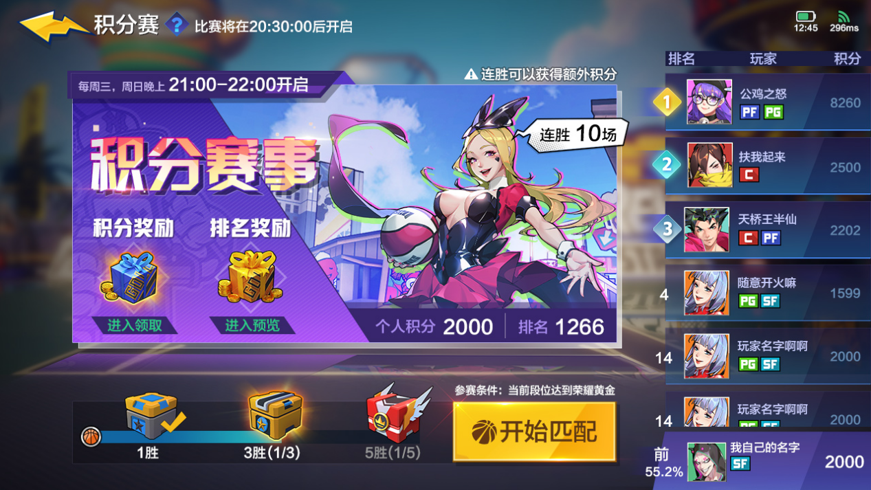 每周日晚23:30,该周的【积分赛】重置,并根据积分和排名为玩家发放奖励。值得一提的是,在【积分赛】中,获胜能够赢取积分,连胜可以获得额外积分,但是如果输掉比赛是不扣分的。因此,只要符合进入资格的玩家大可以在【积分赛】中大胆出击,通过一场又一场实战磨练自己的操作技巧与战术策略,相信经过这个全新赛场的磨练,各位篮球新星的实力一定能获得全新突破!