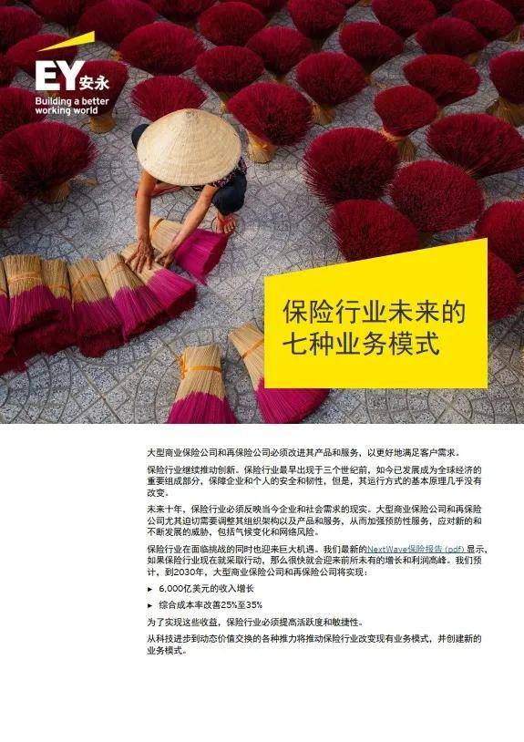 保险业最早出现于三个世纪前,如今已发展成为全球经济的重要组成部分。它保障企业和个人的安全和韧性,但是,其运行方式的基本原理几乎没有改变。安永认为保险业将继续推动创新。大型商业保险公司和再保险公司必须改进其产品和服务,以更好地满足客户需求。