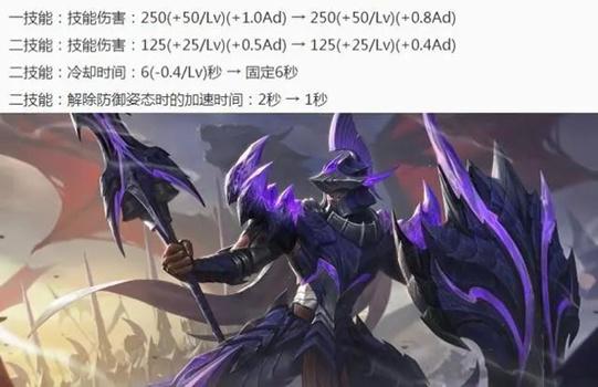 削弱;1/2技能伤害降低,2技能CD固定6s解放防御姿态加速时间减少1s