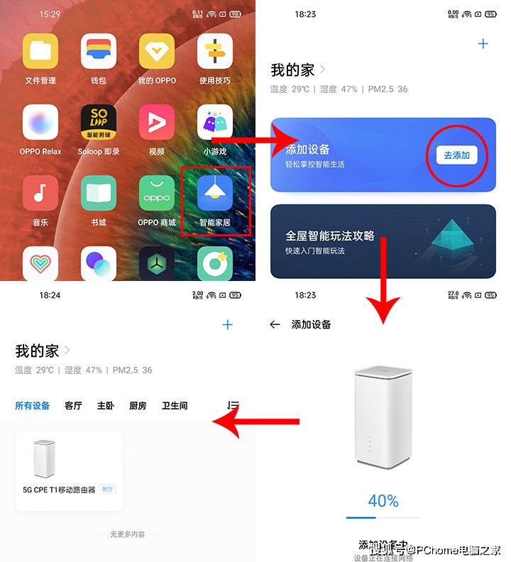 手机端操作非常简单,只要打开HeyTap智能家居,按照上图的步骤添加、识别、连接,即可成功配对。配对成功与帐号绑定好以后,OPPO 5G CPE T1移动路由器就出现在了家庭设备一栏当中,用户可以根据自己的需要,对已连接的智能设备按家庭布局进行归类。