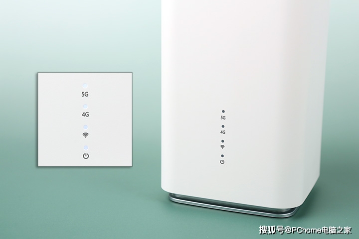 正面下方是四颗LED提示灯,从上到下依次是5G提示灯、4G提示灯、Wi-Fi提示灯、电源提示灯。提示灯的状态提示也非常直观,只要点亮并常亮白灯,就表示正常联网状态。