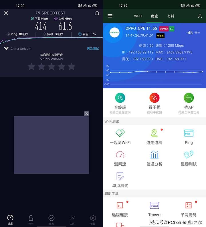 即便是在间隔一堵墙的情况下,OPPO 5G CPE T1移动路由器的5G Wi-Fi峰值速率,依旧可以达到下行414Mbps和上行61.6Mbps,信号强度约为-45dBm。相比之下信号衰减的并不明显,在可以保证接收5G信号的同时,无线Wi-Fi信号也能覆盖家庭中的绝大部分面积。