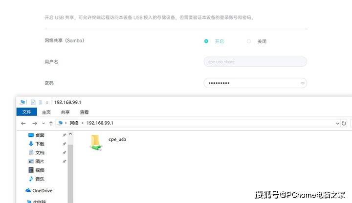 想要访问OPPO 5G CPE T1移动路由器连接的USB设备非常简单,在后台开启USB共享开关,默认会强制设定一个密码。设定好以后,在PC我的电脑地址栏输入:192.168.99.1,然后按回车登陆即可,文件夹“cpe_usb”就是USB接口连接的扩展设备。