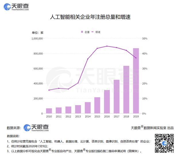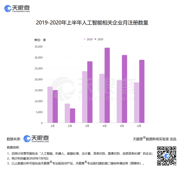 截至7月9日,天眼查数据显示,以工商登记为准,我国今年上半年新增的人工智能相关企业数量超过14万家,较去年同比增长31.35%。其中,今年4月新增注册相关企业数量最多,超过3.4万家。