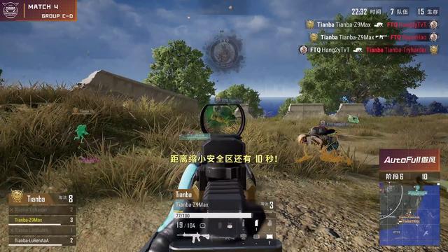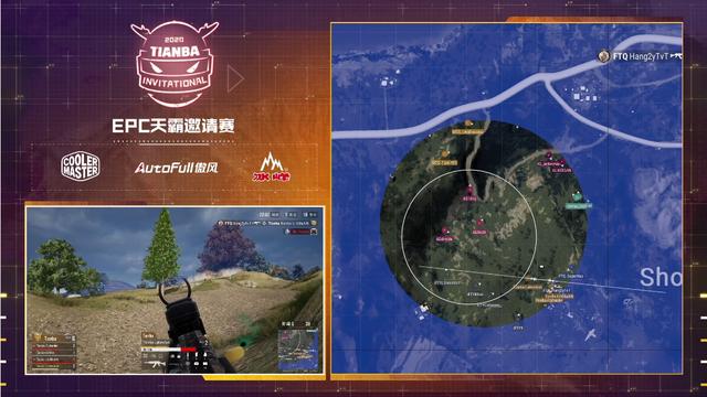 第六阶段,TIANBA战队在安全圈外东南侧山坡上与FTQ再次相遇,T1antian因枪声被FTQ战队发现直接放倒,LinShuNN则是错把大炮当步枪本以为能来一次完美的一串二,结果被FTQ送到千里之外的场外为场上的LuRenA与Z9Max摇旗助威。