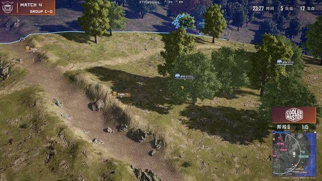 此时,从后方跟上的Z9Max躲在石头掩体后面打了绷带回满了血,并站起身来与斜坡上的FTQ Hang2yTvT来了一波男人之间的较量。只见Z9Max一边利用掩体的优势抵挡着Hang2yTvT的大部分点射,另一边机瞄压枪击倒了对手。随即乘胜追击,直接逼近FTQ的另一位选手,趁这位选手扔手雷之际,近距离点射直接将FTQ淘汰出局。