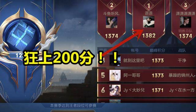 赛季开启一天的时间,就打上了王者,并且在巅峰赛中打到了将近1400分,这是很难想象的,如果是这位女玩家凭借自己的实力打上去的,那么我就要给她点个赞,真给女孩子长脸。