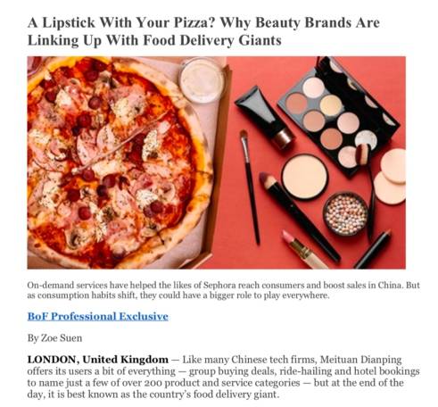 近期,被誉为“时装界《经济学人》”的权威媒体《Business of Fashion》在一篇名为《美妆品牌为何携手外卖巨头》的报道中,深度分析了美团闪购与丝芙兰的合作模式及其行业意义。