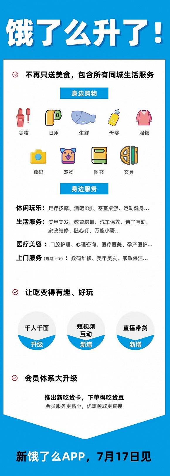 7月10日,饿了么宣布全面升级,从餐饮外卖平台升级为解决用户身边一切即时需求的生活服务平台。