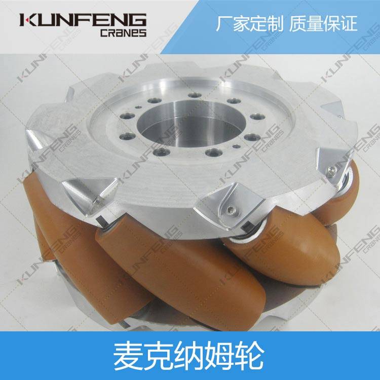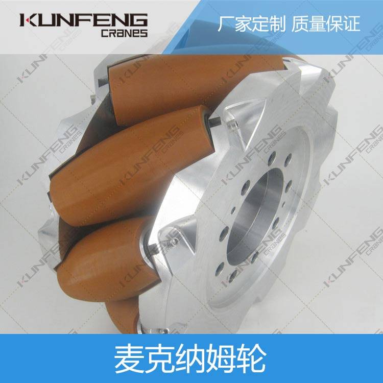 全方位移动平台能实现前进、横向、斜向、旋转运动。麦克纳姆轮是实现是实现其功能的主要部件之一,每个麦克纳姆轮轮都有6 ~ 8个聚氨酯滚轮。昆峰生产的麦克纳姆轮拥有九个聚氨酯辊轮,使用高强度7075铝和高性能聚氨酯制造,具有承载大,同轴精度高,使其行走更平顺,运行噪音更低,运行抖动更小,行驶寿命更高。