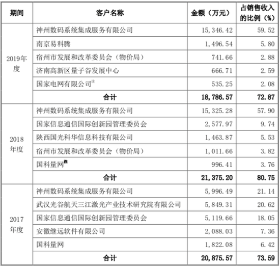 报告期内,公司前五大客户的销售收入占营业收入的比例分别为73.59%、80.75和72.87%,其中神州数码系统集成服务有限公司是目前服务于量子保密通信网络建设方的主要系统集成商,为公司2017年度、2018年度和2019年度第一大客户,占各期营业收入的比例分别为21.14%、57.90%和59.52%。