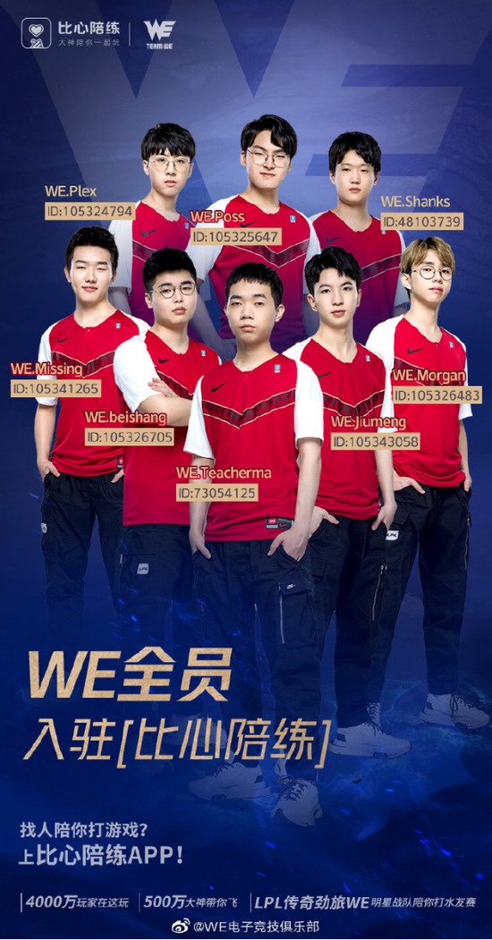WEboy正式出道,同时开启夏季赛!【WEBOY真敢往外说】粉丝专属活动,关注WE选手的比心帐号,在选手比心动态下向他发起采访问题(关于夏季赛和电竞圈的问题都可以问),队员们将在7月13日抽取3个问题回复,最低要求是:知无不答!(不可抗力除外)点赞最高的采访问题选手必定回答!并且将获得WE专属粉丝服。