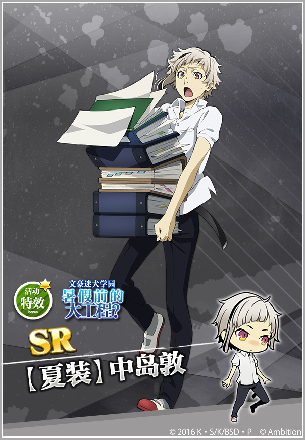 暑假是离开学校、好好享受休闲时光的好机会。不过在休假之前还是有不少事情要忙的,来自武装学生会的中岛敦就在忙碌地搬运着文件,看来直到假期真正开启之前,干劲十足的敦仔都不会懈怠!